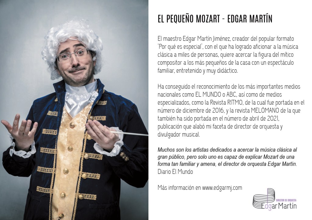 A través de graciosos comentarios, acertijos y juegos, los pequeños (¡y mayores!) irán sumergiéndose a lo largo de este peculiar concierto en el formidable universo de Mozart, ¡y hasta podrán salir a dirigir a los músicos! El concierto es un acercamiento a la música clásica que enganchará a todo el público gracias al característico estilo de Edgar Martín, todo un maestro de la divulgación musical.